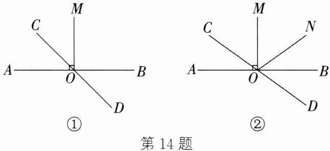 14. 已知直线 AB 与 CD 相交于点 O,OM⊥AB.