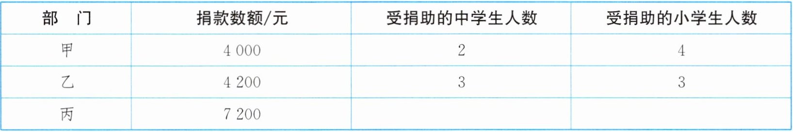 答案:14.(1)由题意,得$\begin{cases}2a + 4b = 4000, \\ 3a + 3b = 4200, \end{cases} $解得$\begin{cases} a = 800, \\ b = 600 \end{cases} (2)$设丙部门员工捐助x名中学生,捐助y名小学生.由题意,得$\begin{cases}800x + 600y = 7200, \\ x + y = 23 - (2 + 4 + 3 + 3), \end{cases} $解得$\begin{cases} x = 3, \\ y = 8. \end{cases} $答:丙部门员工捐助3名中学生,捐助8名小学生