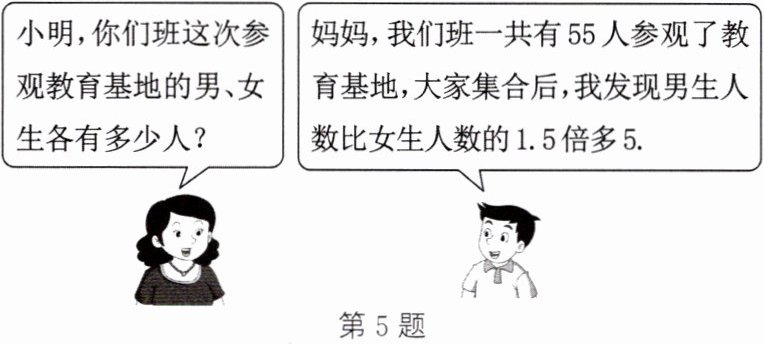 5. 某班男生小明与班上同学一起到教育基地参观,如图所示为小明和妈妈的对话. 请根据对话内容,求小明班上参观教育基地的男生和女生的人数.
