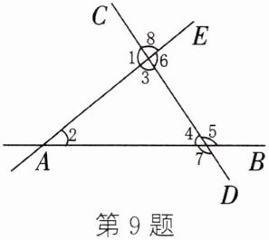 (2)∠A与∠8是直线AB,DE被直线AC所截而形成的同位角;∠A与∠5是直线AB,DE被直线AC所截而形成的同旁内角;∠A与∠6是直线AB,DE被直线AC所截而形成的内错角