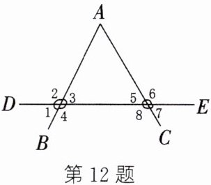 12. 如图,直线$DE$截直线$AB$,$AC$,构成标有数字记号的 8 个角。