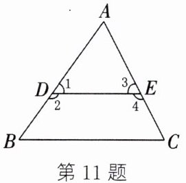 11. 如图,直线$DE$,$BC$被直线$AB$,$AC$所截。