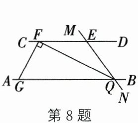 8. 如图,AB//CD,直线 MN 分别与直线 AB,CD 交于点 Q,E,QF 平分∠EQA,交 CD 于点 F,FG⊥FQ,交 AB 于点 G. 若∠MEC = 54°,则∠GFE 的度数为(