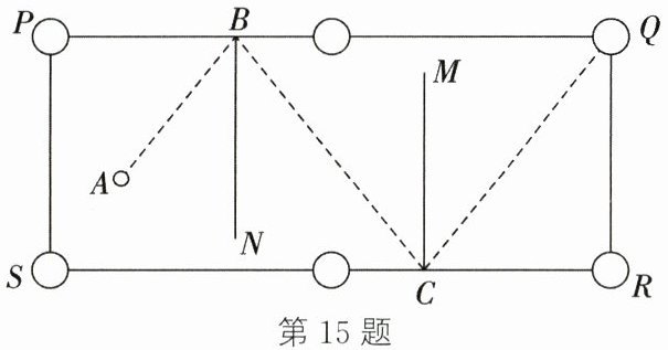 15. 一张台球桌的桌面如图所示,一个球从桌面的点 $A$ 滚向桌边 $PQ$,碰着 $PQ$ 上的点 $B$ 后便反弹而滚向桌边 $RS$,碰着 $RS$ 上的点 $C$ 便反弹而滚入点 $Q$,一共反弹两次。已知 $AB$,$BC$,$CQ$ 都是直线,$PQ// RS$,且 $\angle ABC$ 的平分线 $BN$ 垂直于 $PQ$,$\angle BCQ$ 的平分线 $CM$ 垂直于 $RS$。若 $\angle CQR = 33^{\circ}$,则 $\angle ABP$ 的度数为