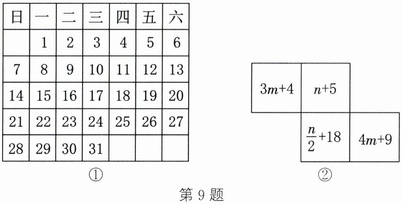 9. 如图①所示为某月的月历,小军用“”形框在月历上框出四个日期,将该“”形框上下左右移动,且一定要框住月历中的四个日期。若四个日期如图②所示,则$m$,$n$的值分别为(