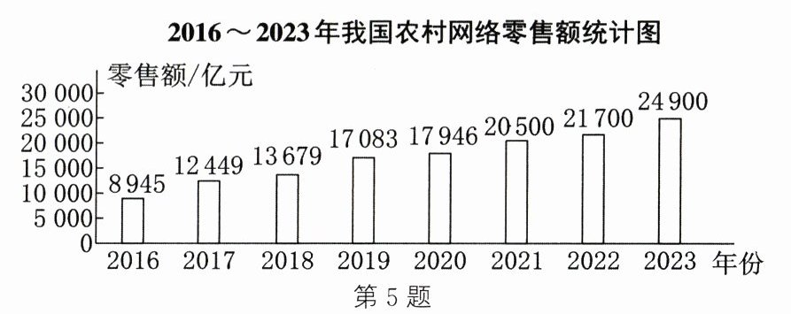 5. 近年来,我国重视农村电子商务的发展。如图所示的统计图反映了2016~2023年我国农村网络零售额的情况,根据统计图提供的信息判断,下列结论错误的是(