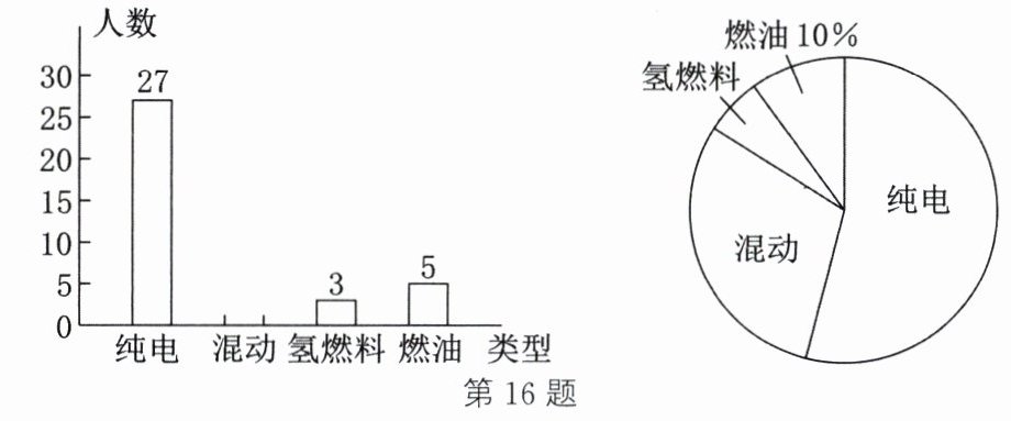 16.(1)50 30 6 (2)最喜欢的汽车类型为“混动”类的人数为50−27−3−5=15.补全条形图如图所示 (3)扇形图中“混动”类所在扇形的圆心角的度数为360°×30%=108°