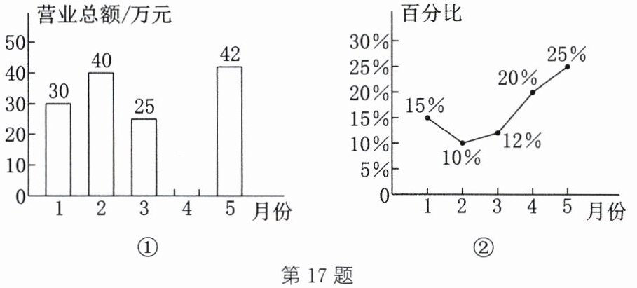17. (14分)如图①所示为某书店今年1~5月的各月营业总额情况的条形图,如图②所示为该书店“党史”类书籍的各月营业额占书店当月营业总额百分比情况的折线图。若该书店1~5月的营业总额一共是182万元,观察图①②,解答下列问题: