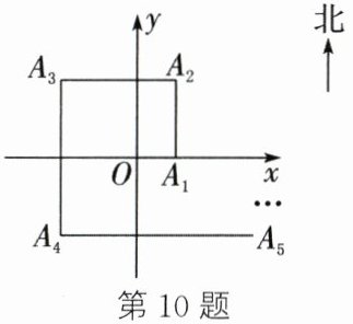 10. 如图,一只蚂蚁从平面直角坐标系的原点$O$出发,向正东方向爬$3$个单位长度到达点$A_1$,再向正北方向爬$6$个单位长度到达点$A_2$,再向正西方向爬$9$个单位长度到达点$A_3$,再向正南方向爬$12$个单位长度到达点$A_4$,再向正东方向爬$15$个单位长度到达点$A_5······$以此规律爬下去,当蚂蚁到达点$A_{10}$时,该点的坐标为(