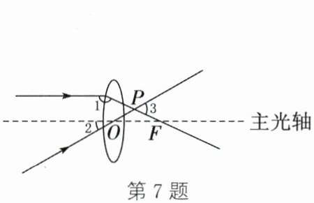 7. 如图,一束平行于主光轴的光线经凸透镜折射后,其折射光线与一束经过光心$O$的光线相交于点$P$,$F$为焦点。若$\angle1 = 155^{\circ}$,$\angle2 = 30^{\circ}$,则$\angle3$的度数为(