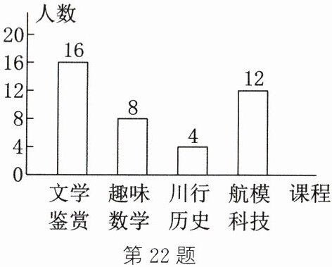 22. (12 分)某校拟开设四门校本课程供学生选择:文学鉴赏、趣味数学、川行历史、航模科技。为了解该校七年级$1000$名学生对这四门校本课程的选择意向,张老师做了以下工作(顺序已打乱):① 抽取$40$名学生作为调查对象;② 整理数据并绘制统计图;③ 收集$40$名学生对四门校本课程的选择意向的相关数据;④ 结合统计图分析数据并得出结论。