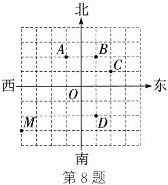 8. 如图,小明从点 $ O $ 出发,先向西走 40 m,再向南走 30 m 到达点 $ M $。如果点 $ M $ 的位置用 $ (-40,-30) $ 表示,那么 $ (10,20) $ 表示的位置是(