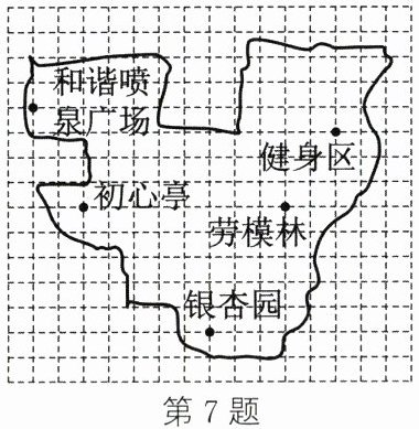 7. “健步走”越来越受到人们的喜爱,某个“健步走”小组将自己的活动场地定在某公园,所走路线为和谐喷泉广场→初心亭→银杏园→劳模林→健身区。如图,如果在该公园设计图上初心亭的坐标为 $ (-5,-1) $,银杏园的坐标为 $ (0,-6) $,那么健身区的坐标为(