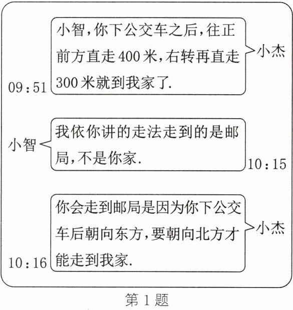 1. 如图所示为小杰使用手机内的通信软件跟小智对话的记录.根据图中两人的对话记录,下列能从邮局出发走到小杰家的走法是(