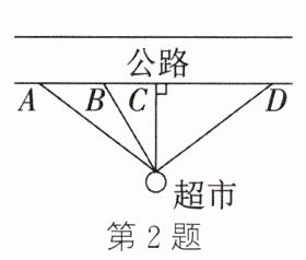 2. 如图,某地进行城市规划,在一条新修公路旁有一家超市,现要建一个汽车站,且有点 $A$,$B$,$C$,$D$ 四处可供选择。若要使超市距离汽车站最近,则汽车站应建在(