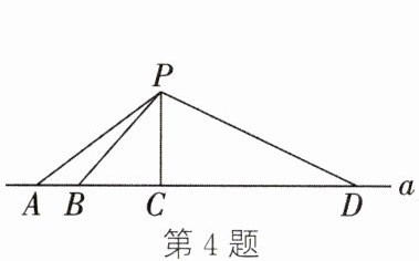 4. 如图,$P$ 是直线 $a$ 外一点,$A$,$B$,$C$,$D$ 为直线 $a$ 上的点,$PA = 5$,$PB = 4$,$PC = 3$,$PD = 7$,则点 $P$ 到直线 $a$ 的距离的最大值为
