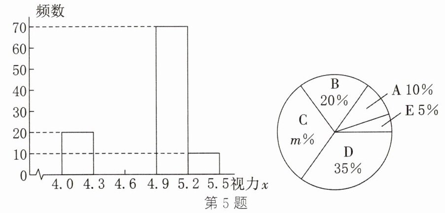 5. 某市对全市16000名七年级学生进行了一次视力抽样调查,并根据统计数据,制作了如下统计表和如图所示的统计图。