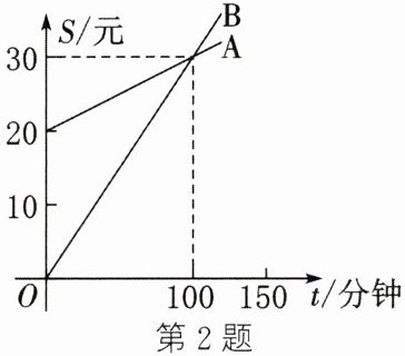 2. 某通信公司手机的收费标准有A,B两类,已知每月应缴费用S(元)与通话时间t(分钟)之间的关系如图所示.当通话时间为180分钟时,按这两类收费标准缴费的差为