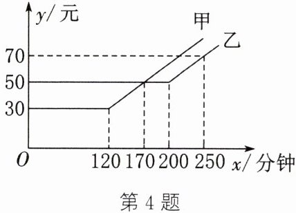 答案:4.C 解析:当x≥120时,设甲公司的收费与通话时间的函数解析式为y_甲=k₁x+b₁(k₁,b₁为常数,且k₁≠0).将(120,30)和(170,50)分别代入y_甲=k₁x+b₁,得$\begin{cases}120k₁+b₁=30,\\170k₁+b₁=50,\end{cases}$解得$\begin{cases}k₁=0.4,\\b₁=-18,\end{cases}$