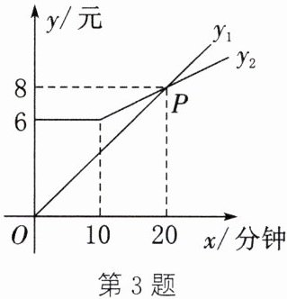 答案:3.(1)当x≥10时,B品牌共享电动车每分钟收费(8-6)÷(20-10)=0.2(元),则y₂=6+0.2(x-10)=0.2x+4,