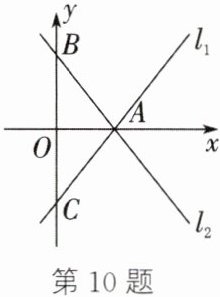 10. 如图,直线 $ l_1:y = 2x - 5 $ 与 $ l_2:y = kx + b $ 都经过 $ x $ 轴上的点 $ A $,分别与 $ y $ 轴交于 $ C $,$ B $ 两点,且 $ B $,$ C $ 两点关于原点对称,则直线 $ l_2 $ 对应的函数解析式为