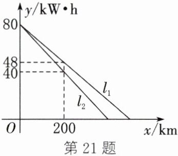 21.(2025·启东一模)某公司生产了 $ A $,$ B $ 两款新能源电动汽车。如图,$ l_1 $,$ l_2 $ 分别表示 $ A $ 款,$ B $ 款新能源电动汽车充满电后电池的剩余电量 $ y $(kW·h) 与汽车行驶路程 $ x $(km) 之间的关系。当两款新能源电动汽车的行驶路程相等时,$ A $ 款新能源电动汽车电池的剩余电量比 $ B $ 款新能源电动汽车电池的剩余电量多 $ 12 $ kW·h,则此时它们行驶的路程均为