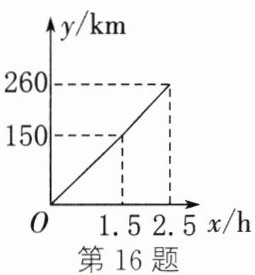 16. “十一”黄金周期间,乐乐一家自驾游去了离家 $ 260 $ km 的某地游玩,如图是他们离家的距离 $ y $(km) 与汽车行驶时间 $ x $(h) 之间的函数图象,乐乐一家出发 $ 2.3 $ h 时,离目的地还有(