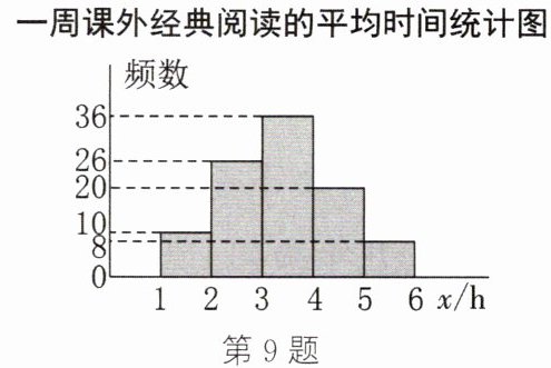 9. 某中学把开展课外经典阅读活动作为一项引领学生明是非、知荣辱、立志向、修言行的德育举措.为了调查活动开展情况,需要了解全校2000名学生一周的课外经典阅读时间.从本校学生中随机抽取100名进行调查,将调查的一周课外经典阅读的平均时间$x(h)$分为5组:① $1\leqslant x<2$;② $2\leqslant x<3$;③ $3\leqslant x<4$;④ $4\leqslant x<5$;⑤ $5\leqslant x<6$,并将调查结果用如图所示的统计图描述.根据以上信息,解答下列问题: