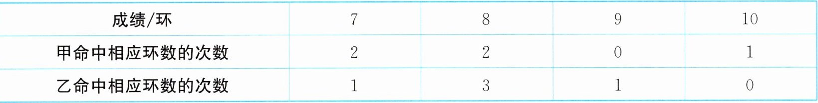 答案:5.$\bar{x}_{甲}=\frac{1}{5} × (7 × 2+8 × 2+9 × 0+10 × 1)=8(环)$,$\bar{x}_{乙}=\frac{1}{5} ×$
