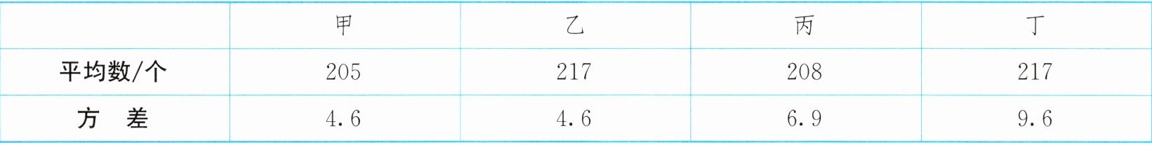 乙和丁的平均数最高(217个),高于甲(205个)和丙(208个)。