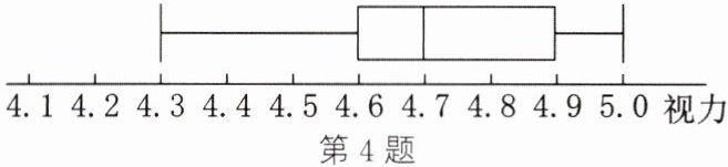 答案:4. (1)最大值是5.0,最小值是4.3,Q₁=4.6,Q₂=4.7,Q₃=4.9 (2)从箱线图整体看,大部分数据(中间50%的数据,即Q₁到Q₃之间的数据)集中在4.6到4.9这个范围内,说明班级同学视力的中间水平在这个区间,中位数Q₂=4.7表示班级同学视力的中间值为4.7,有一半同学的视力高于4.7,一半同学的视力低于4.7;最小值为4.3,最大值为5.0,说明班级同学的视力的波动范围是从4.3到5.0,存在一定的差异