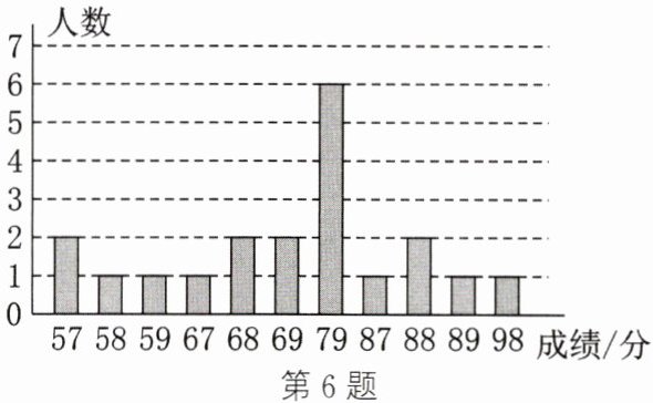 将成绩按从小到大排序:57,57,58,59,67,67,68,68,69,69,79,79,79,79,79,79,87,88,88,98。