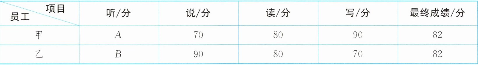 2. (2025·福建)某公司为选拔英语翻译员,举行听、说、读、写综合测试,其中听、说、读、写各项成绩(百分制)按4∶3∶2∶1的比计算最终成绩.参与选拔的甲、乙两名员工的听、说、读、写各项测试成绩及最终成绩如下表: