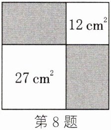 8. (教材变式)如图,从一个大正方形中裁去面积为$12\mathrm{cm}^2$和$27\mathrm{cm}^2$的两个小正方形,则大正方形的边长是(