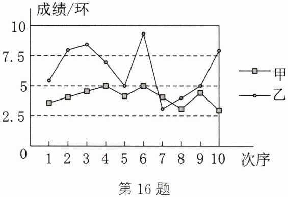 16. (2024·兰州)甲、乙两人在相同条件下各射击10次,两人的成绩如图所示.有下列说法:① 甲的成绩更稳定;② 乙的平均成绩更高;③ 每人再射击一次,乙的成绩一定比甲高.其中,正确的是