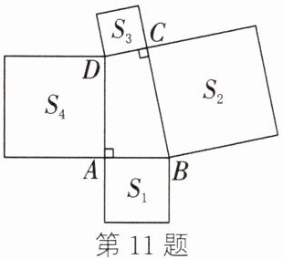 11. 如图,在四边形$ABCD$中,$\angle DAB = \angle BCD = 90^{\circ}$,分别以四边形的四条边为边向外作四个正方形,面积分别记为$S_{1}$,$S_{2}$,$S_{3}$,$S_{4}$。若$S_{1} + S_{4} = 135$,$S_{3} = 49$,则$S_{2} =$