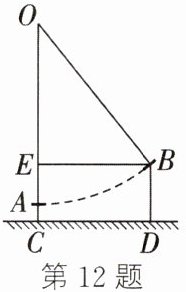 12. (2024·启东期末)明朝数学家程大位在他的著作《算法统宗》中写了一首计算秋千绳索长度的词《西江月》:“平地秋千未起,踏板一尺离地,送行二步恰竿齐,五尺板高离地……”其大意如下:如图,秋千$OA$静止的时候,踏板离地面一尺$(AC = 1$尺),将它往前推进两步$(EB = 10$尺),此时踏板升高,离地五尺$(BD = 5$尺),则秋千绳索$(OA$或$OB)$的长度为