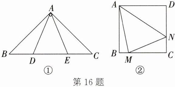 16. 如图①,在$Rt\triangle ABC$中,$\angle BAC = 90^{\circ}$,$AB = AC$,$D$,$E$是边$BC$上的任意两点,且$\angle DAE = 45^{\circ}$。