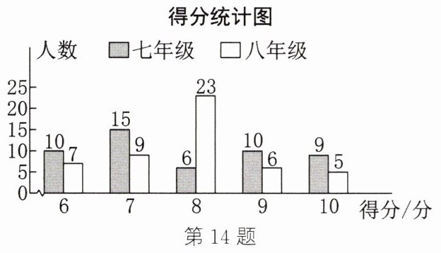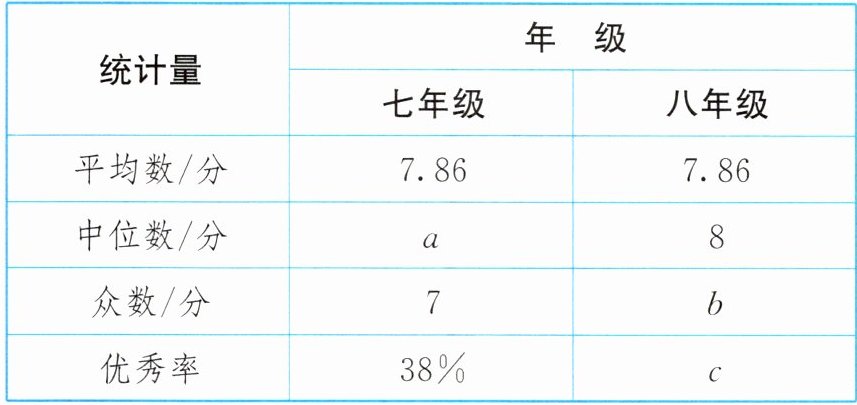 14. (2025·河南)为加强对青少年学生的宪法法治教育,普及宪法法治知识,教育部决定举办第十届全国学生“学宪法 讲宪法”活动.某学校为了解学生对宪法法治知识的掌握情况,从七、八年级各随机抽取$50$名学生进行测试,并对测试得分(单位:分,满分为$10$分,$9$或$9$分以上为优秀)进行整理、描述、分析,得到如图所示的统计图和如下统计表.