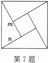 7. (2024·南通)“赵爽弦图”巧妙利用面积关系证明了勾股定理.如图所示的“赵爽弦图”是由四个全等的直角三角形和中间的小正方形拼成的一个大正方形.设直角三角形的两条直角边的长分别为m,n(m>n).若小正方形的面积为5,$(m+n)^{2}=21$,则大正方形的面积为(