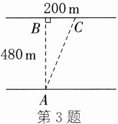 3. 如图,某人要横渡一条宽480m的河,从点A处出发,由于受水流的影响,实际上岸地点C与想要到达的地点B相距200m,则他在河中实际游了