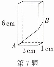 7. 如图,长方体的长、宽、高分别为 $3\mathrm{cm}$,$1\mathrm{cm}$,$6\mathrm{cm}$.如果一只小虫从点 $A$ 开始爬行,经过两个侧面爬行到另一条侧棱的中点 $B$ 处,那么这只小虫所爬行的最短路程为(