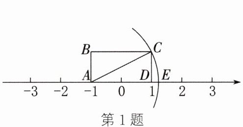 1. (教材变式)(2025·海安期中)如图,长方形 $ABCD$ 的边 $AD$ 的长为 $2$,$AB$ 的长为 $1$,点 $A$ 在数轴上对应的数是 $-1$,以点 $A$ 为圆心,对角线 $AC$ 长为半径画弧,交数轴于点 $E$,点 $E$ 表示的实数是(