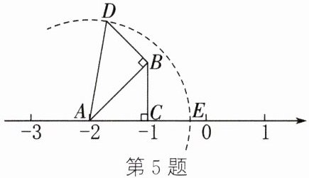 5. 如图,将有一边重合的两张直角三角形纸片放在数轴上,纸片上的点 $A$ 表示的数是 $-2$,$AC = BC = BD = 1$.若以点 $A$ 为圆心,$AD$ 的长为半径画弧,与数轴交于点 $E$(点 $E$ 位于点 $A$ 的右侧),则点 $E$ 表示的数为