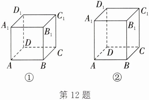 12.(1)如图①,将正方体的“前面”和“右面”展开在同一平面上,连接$AC_{1}$,最短路程就是线段$AC_{1}$的长.由题意,得$AB = BC = CC_{1} = 5cm$.$\therefore AC = 10cm$.在$Rt\triangle ACC_{1}$中,由勾股定理,得$AC_{1}=\sqrt{AC^{2}+CC_{1}^{2}} = 5\sqrt{5}cm$.$\therefore$蚂蚁需要爬行的最短路程为$5\sqrt{5}cm$ (2)情况一:如图②,将长方体的“前面”和“右面”展开在同一平面上,连接$AC_{1}$.由题意,得$AB = BC = 5cm$,$CC_{1} = 6cm$.$\therefore AC = 10cm$.在$Rt\triangle ACC_{1}$中,由勾股定理,得$AC_{1}=\sqrt{AC^{2}+CC_{1}^{2}} = 2\sqrt{34}cm$.情况二:如图③,将长方体的“前面”和“上面”展开在同一平面上,连接$AC_{1}$.由题意,得$A_{1}D_{1} = C_{1}D_{1} = 5cm$,$AA_{1} = 6cm$.$\therefore AD_{1} = 11cm$.在$Rt\triangle AC_{1}D_{1}$中,由勾股定理,得$AC_{1}=\sqrt{AD_{1}^{2}+C_{1}D_{1}^{2}}=\sqrt{146}cm$.情况三:如图④,将长方体的“下面”和“右面”展开在同一平面上,连接$AC_{1}$.由题意,得$B_{1}B = 6cm$,$B_{1}C_{1} = AB = 5cm$.$\therefore AB_{1} = 11cm$.在$Rt\triangle AB_{1}C_{1}$中,由勾股定理,得$AC_{1}=\sqrt{B_{1}C_{1}^{2}+AB_{1}^{2}}=\sqrt{146}cm$.$\because 2\sqrt{34}<\sqrt{146}$,$\therefore$蚂蚁需要爬行的最短路程为$2\sqrt{34}cm$
