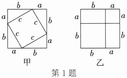 1. 如图,学习勾股定理时,甲同学用四个相同的直角三角形(直角边长分别为$a$,$b$,斜边长为$c$)构成一个大正方形,乙同学用边长分别为$a$,$b$的两个正方形和长为$b$、宽为$a$的两个长方形构成一个大正方形。甲、乙两名同学给出的构图方案,可证明勾股定理的是(