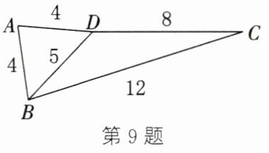 9. 一个零件的形状如图所示,按规定这个零件中的$\angle A$和$\angle BDC$都应为直角,将量得的这个零件各边尺寸标注在图中,由此可知(