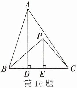 16. 如图,在$\triangle ABC$中,$BC = 2$,$AD⊥ BC$,垂足为$D$,$P$为直线$BC$上方的一个动点,过点$P$作$PE⊥ BC$,垂足为$E$。若$PE = \frac{1}{2}BC$,则$PB + PC$的最小值为(
