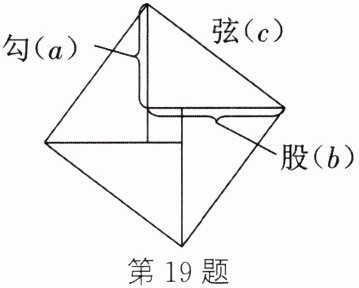 19. 我国古代数学家赵爽证明勾股定理时创制了一幅“弦图”,后人称之为“赵爽弦图”,它是由$4$个全等的直角三角形和$1$个小正方形组成的。如图,直角三角形的直角边长分别为$a$,$b$,斜边长为$c$。若$b - a = 4$,$c = 20$,则每个直角三角形的面积为