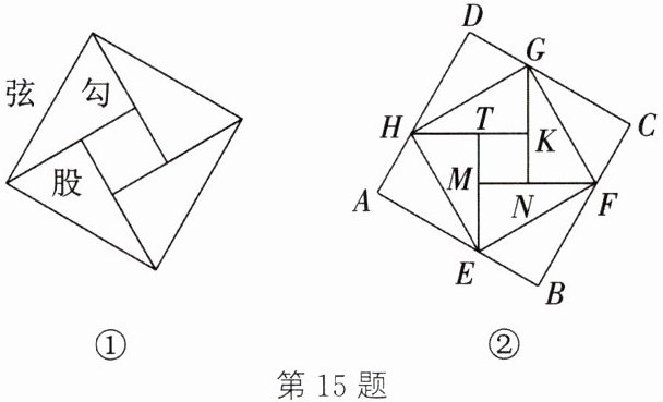 15. (新考向·数学文化)我国汉代数学家赵爽为了证明勾股定理,创制了一幅“弦图”,后人称其为“赵爽弦图”(如图①)。图②由弦图变化得到,它是由八个全等的直角三角形拼接而成的。记图②中正方形$ABCD$、正方形$EFGH$、正方形$MNKT$的面积分别为$S_{1}$,$S_{2}$,$S_{3}$。若$S_{1}+S_{2}+S_{3}=27$,则$S_{2}$的值是(